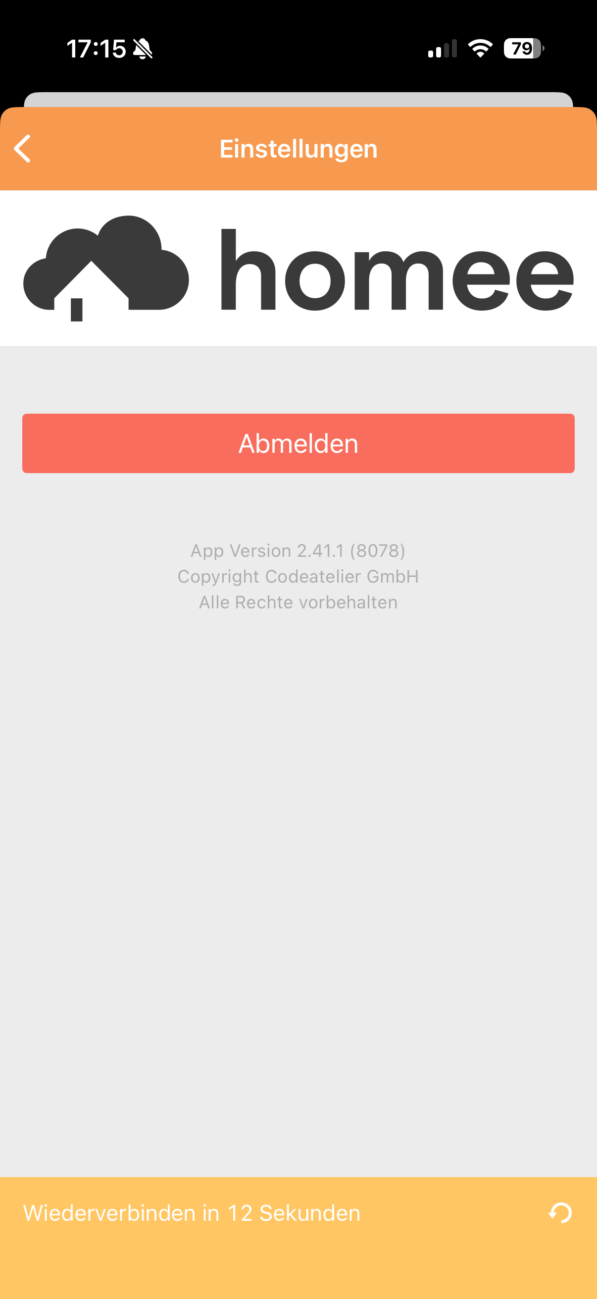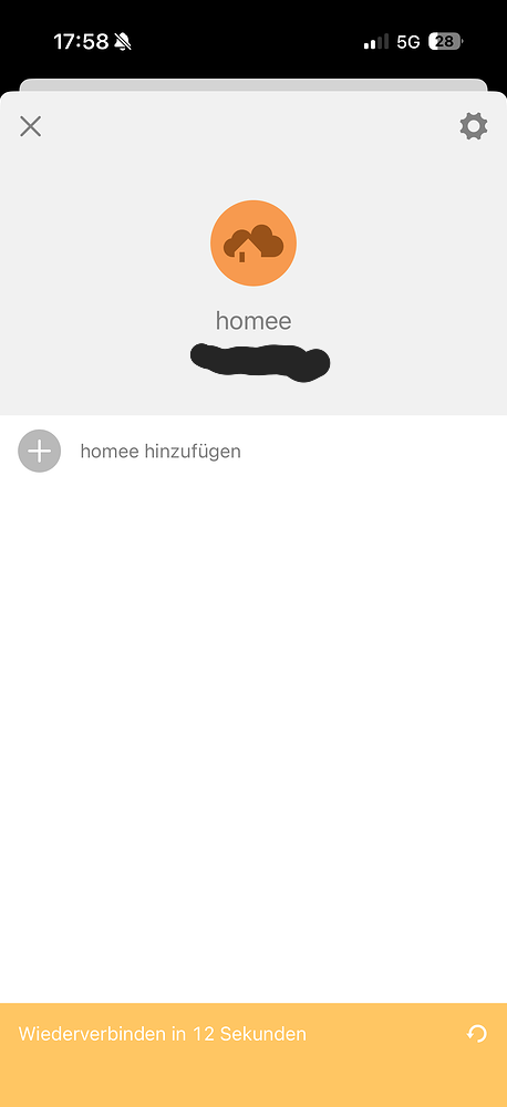 Hier sehe ich den Homee mit seiner id aber keine Geräte und er stellt keine Verbindung her. Er dreht und dreht…