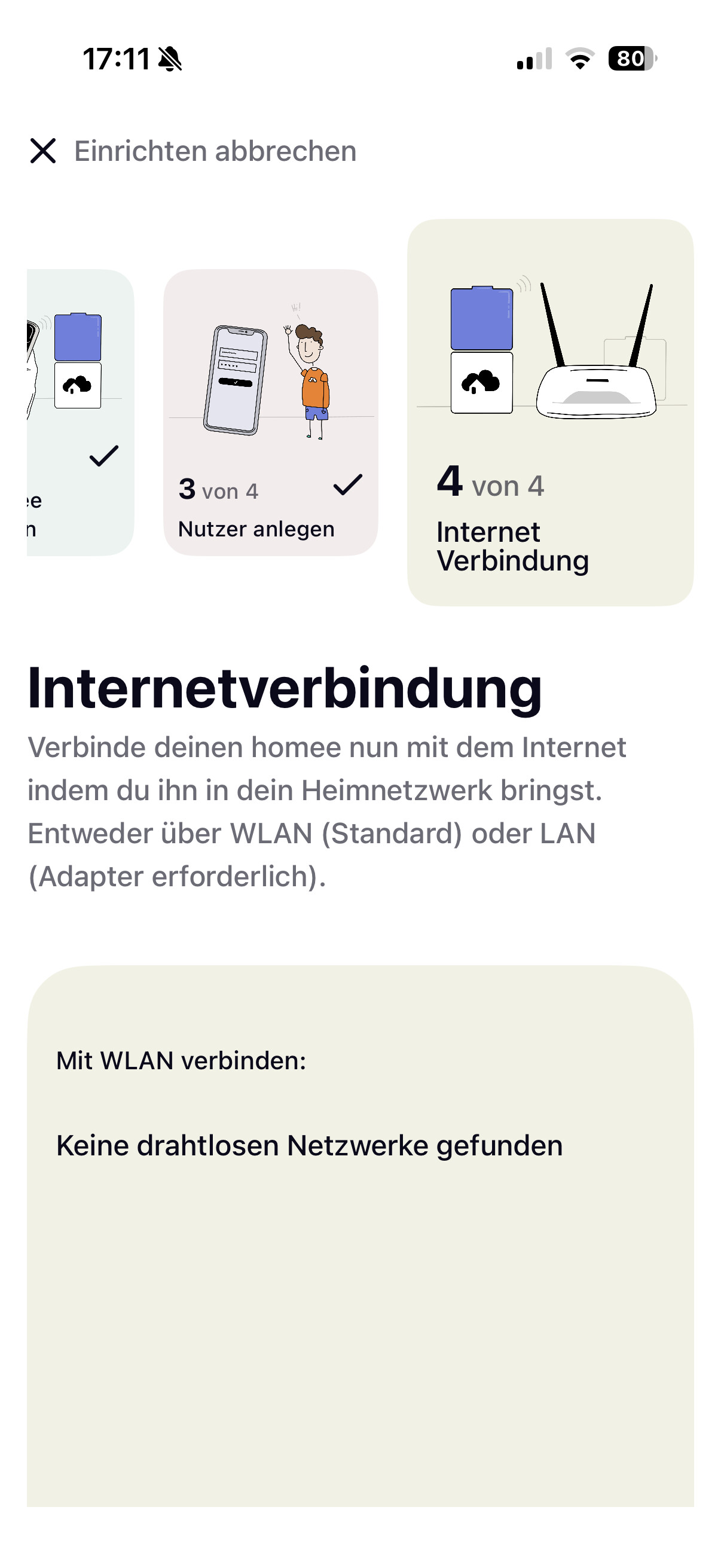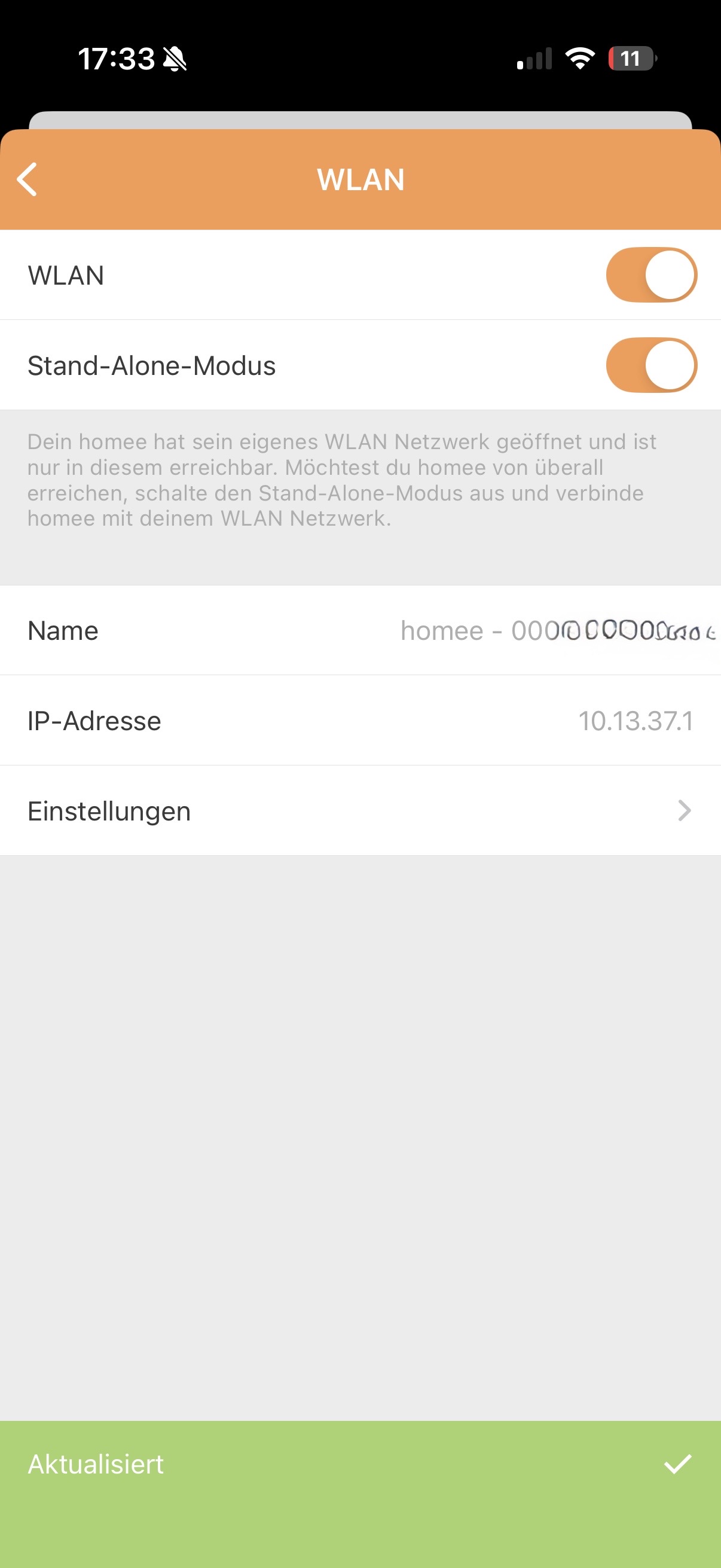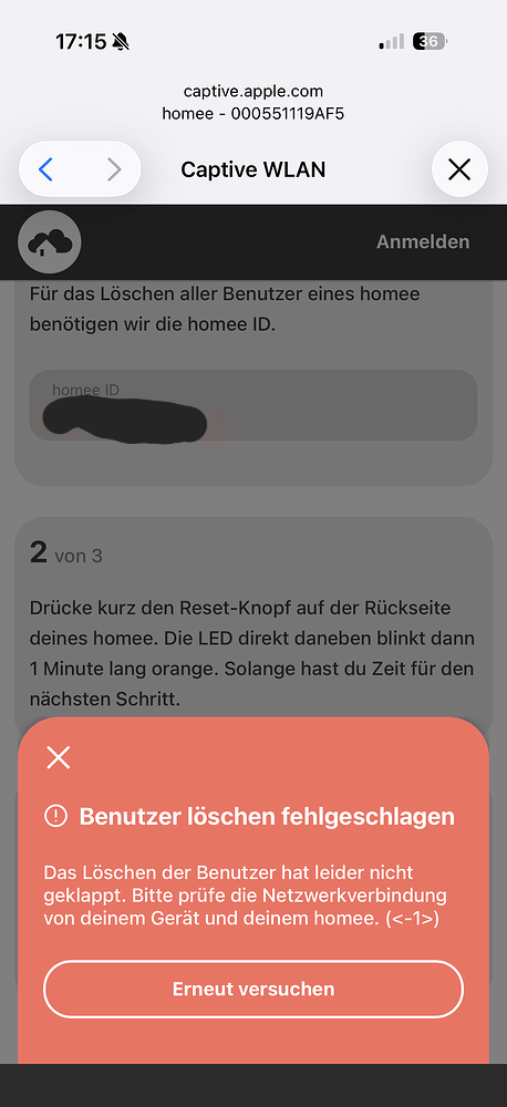 Dann war der Werksreset erfolgreich, der homee hat jetzt wieder sein eigenes WLAN geöffnet, damit musst Du Dich verbinden, so wie damals bei der Ersteinrichtung.