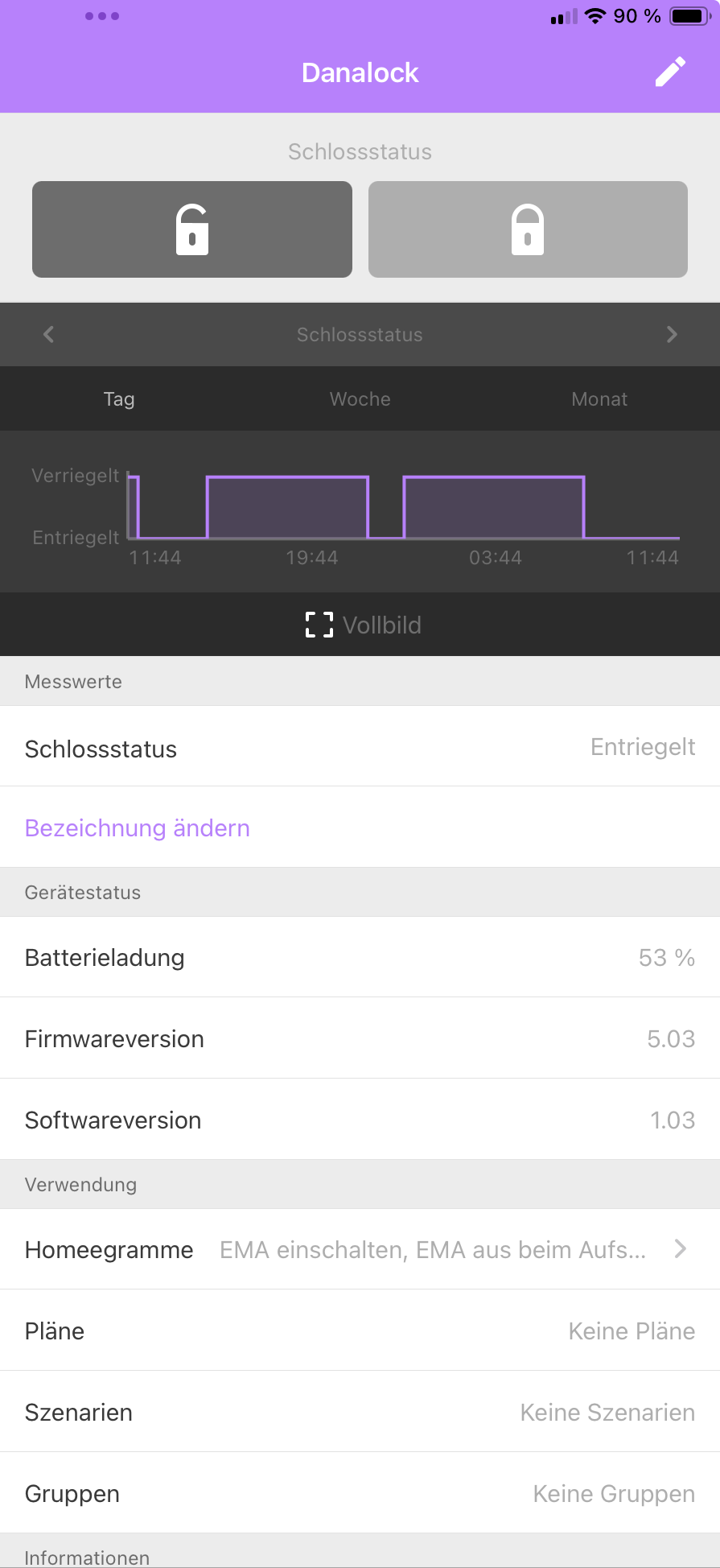 Ein Keypad ist doch eine sehr spezielle Geräteklasse. Vor allem, wenn ich die Eingabe der gültigen PINs in der homee-Oberfläche abbilden will, ist das nicht mal eben implentiert. Wenn man das lokal am PIN-Pad macht und das PIN-Pad lediglich den Status offen/geschlossen o.ä. an homee meldet, wäre das ungleich einfacher. Das Danalock-PIN-Pad wird per Bluetooth mit dem Danalock verbunden. Die Programmierung und Einstellung der Parameter des Schlosses und die Eingabe und das Löschen der PINs erfolgt über die DanalockApp auf dem Handy. Auch das Kalibrieren und ein Firmwareupdate wird über die DanalockApp realisiert.
