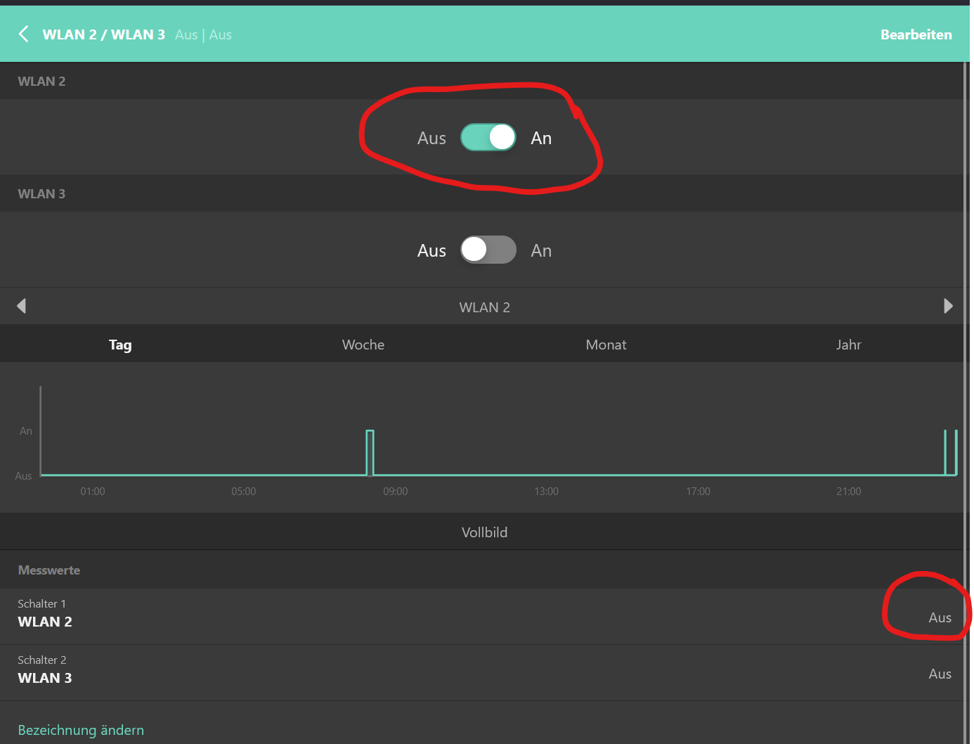 Nachdem ich den Regler auf „An“ stelle, wird der Zustand erst stark verzögert verändert.