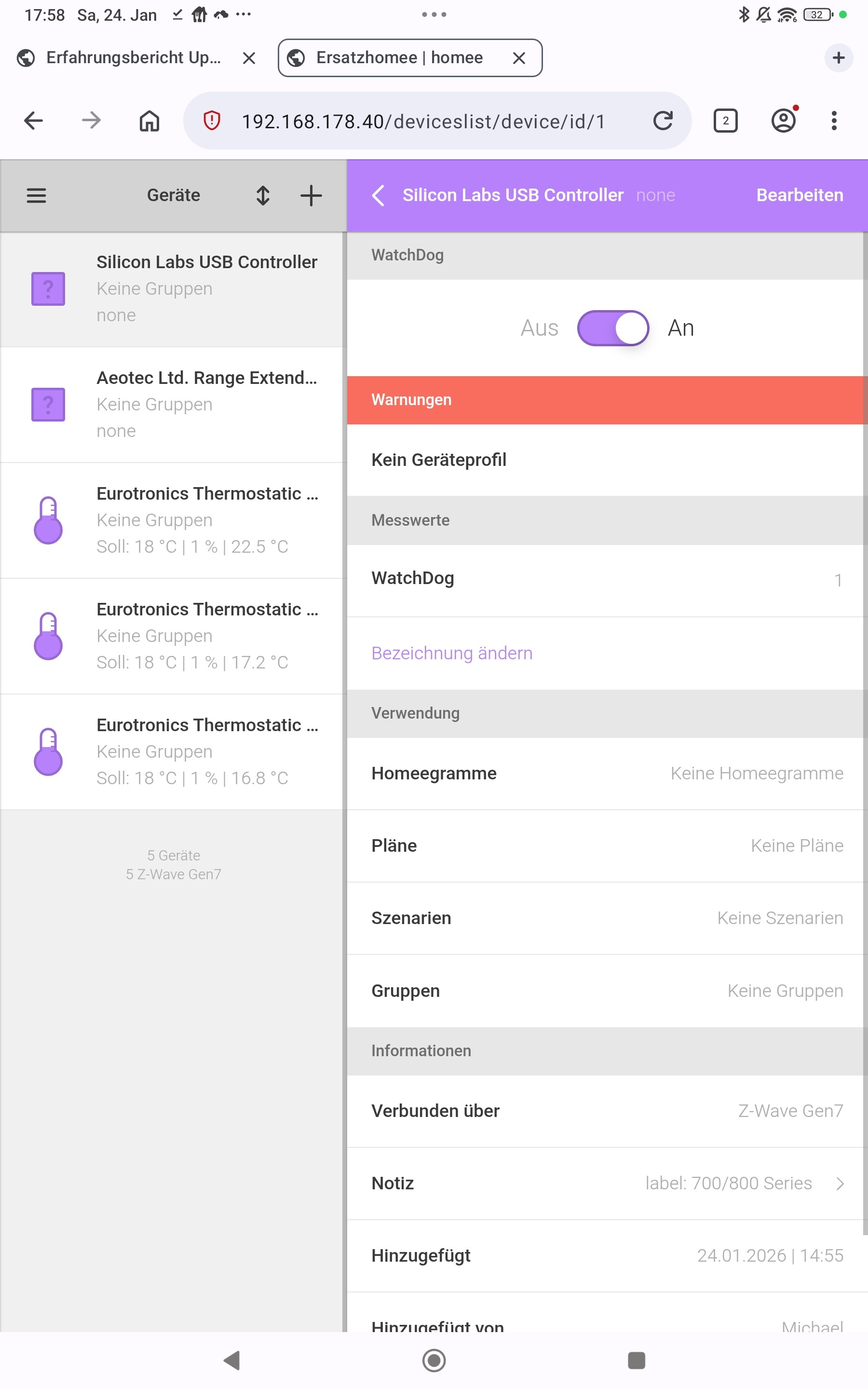 Ich habe den homee-Labor Würfel mal einmal komplett heruntergefahren und neu gestartet. Und sieh an sieh an. Die drei HKT vorhanden der Range Extender 7 auch allerdings auch immer noch der SILICON Labs USB CONTROLLER