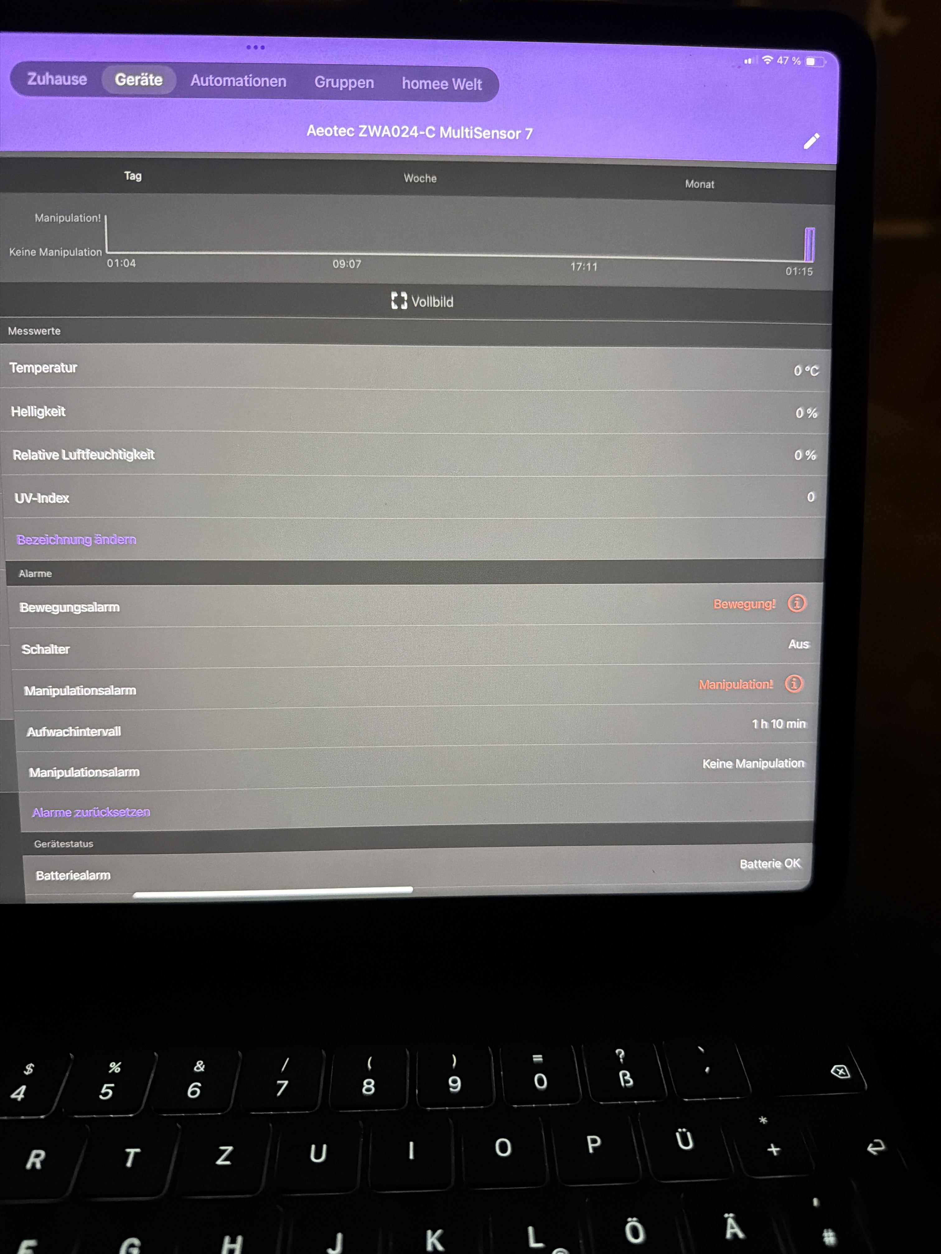 .2. Warum kann man den Bewegungsalarm überhaupt zurücksetzen? Dieser spiegelt einen Wert des Sensors wieder und ist nicht nur ein Event, dass man manuell zurücksetzen muss. Dürfte IMO nicht sein und würde ich somit erstmal als Bug einstufen.