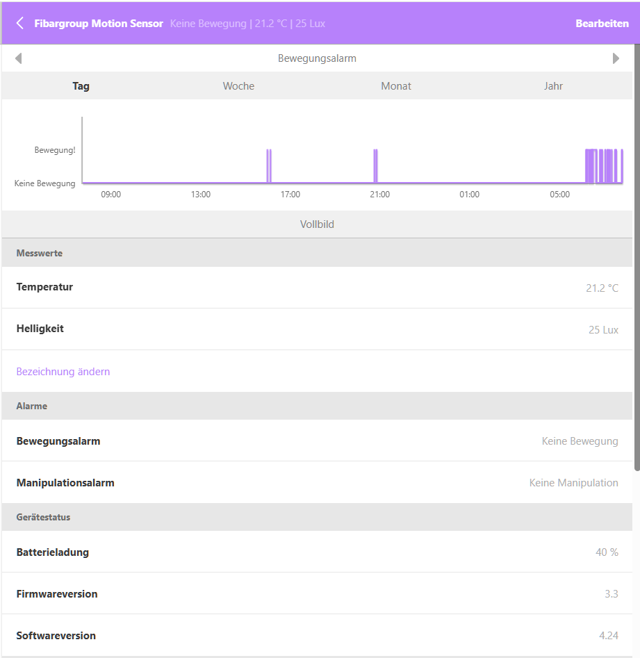 Meine uralten Fibaro Motion Sensoren haben 3.2/4.5, Steffen seiner 3.3/4.24, und hier werden Bewegung, Manipulation, Temperatur, Helligkeit und Batterie angezeigt, sowie die Graphen zu den Messwerten.