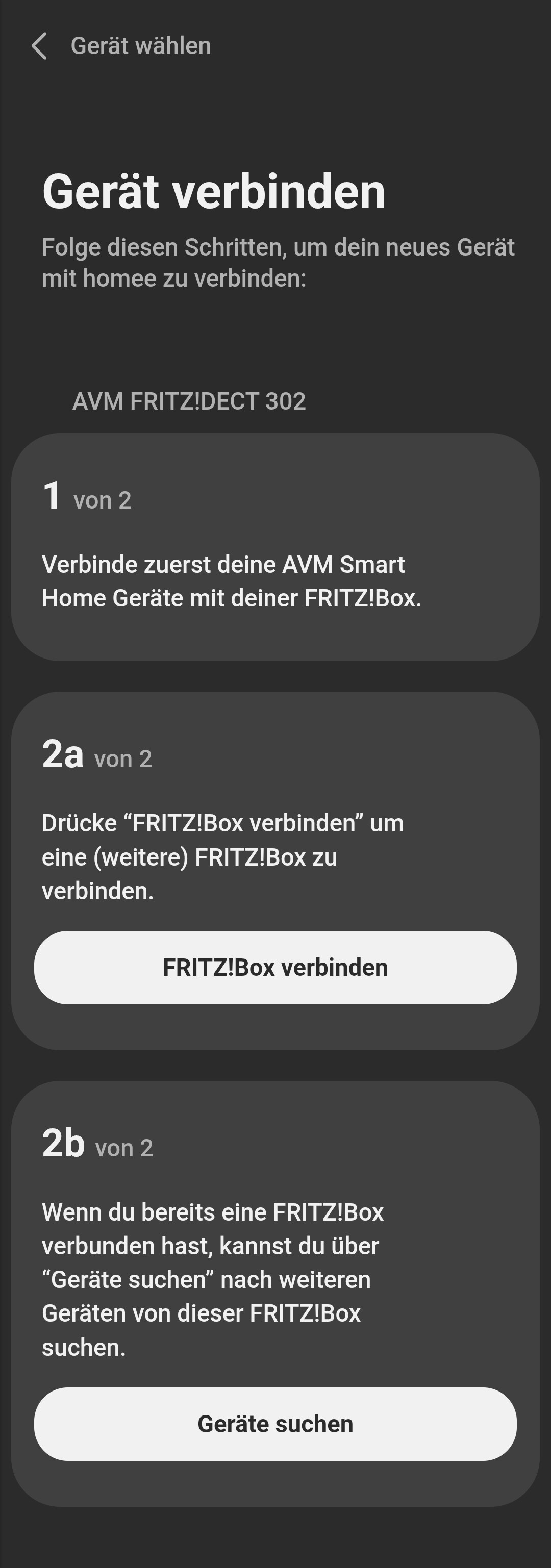 Fritz Thermostat an der Fritzbox anlernen, dort alle Automationen ausschalten, homee mit der Fritzbox verbinden und Gerät suchen: