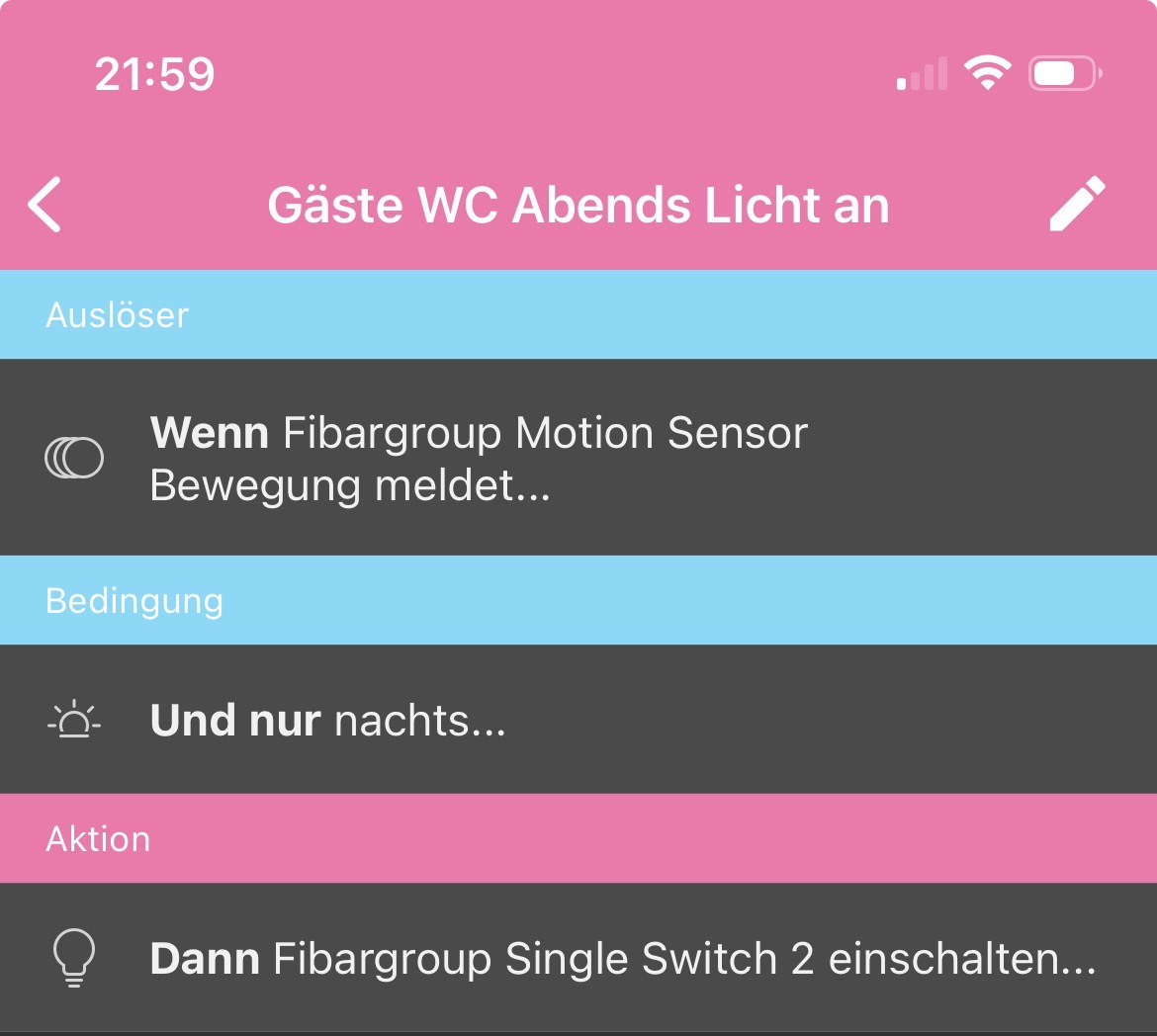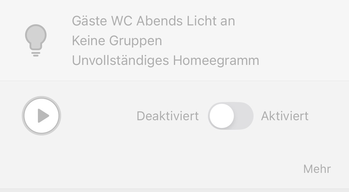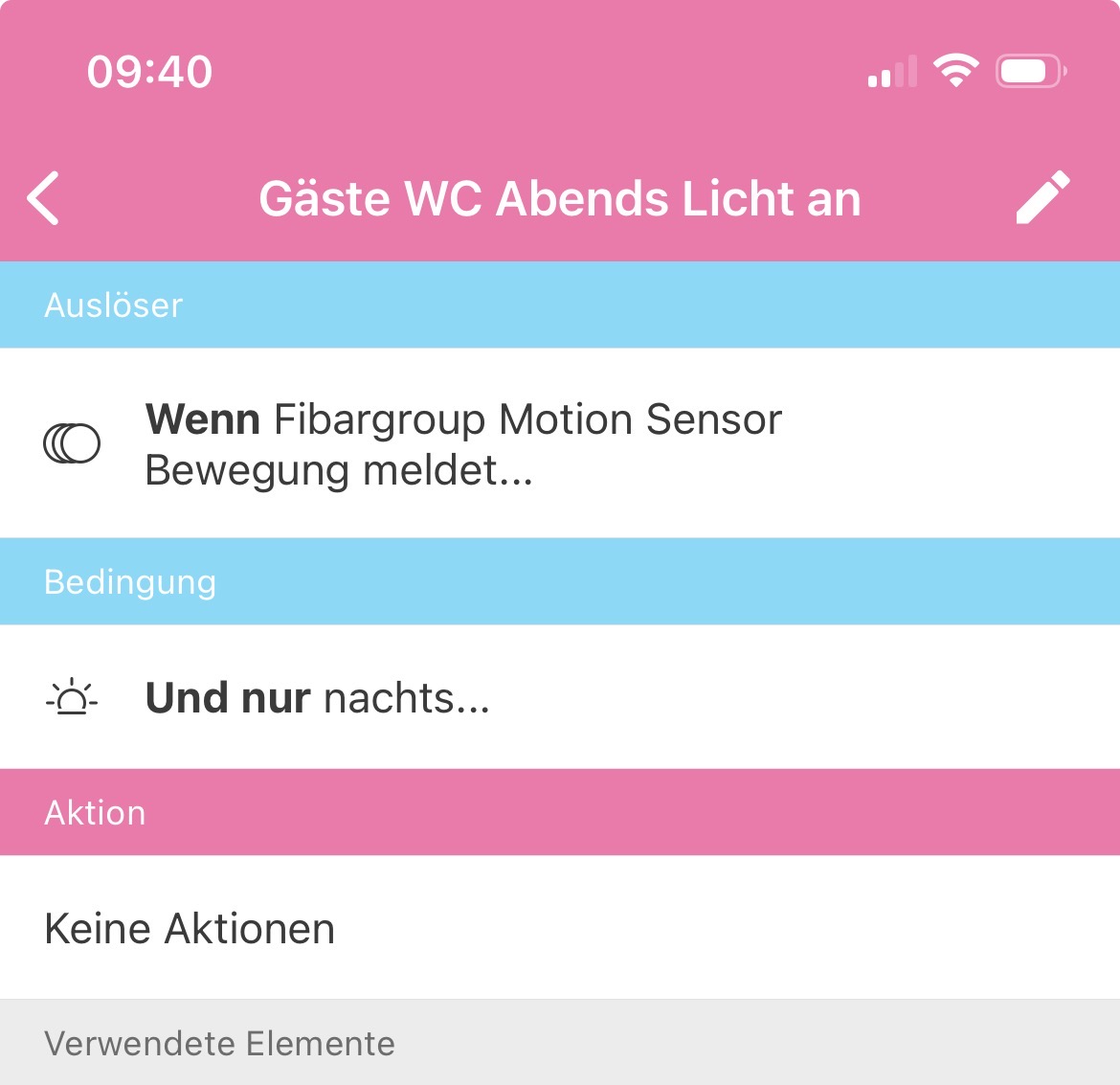 Aktionen → HG wird als unvollständig gemeldet. Die Aktion (ebenfalls der Fibaro Single Switch 2), dass das Licht eingeschaltet werden soll, funktioniert bis zu einem Neustart des homees - danach ist die Aktion nicht mehr vorhanden