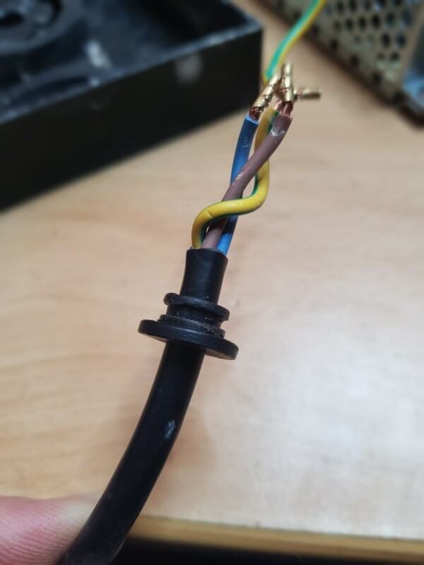 Im Inneren wurde das Netzteil mit dem Gehäuse aus dem 3D-Drucker montiert (hier noch ohne Aderendhülsen).