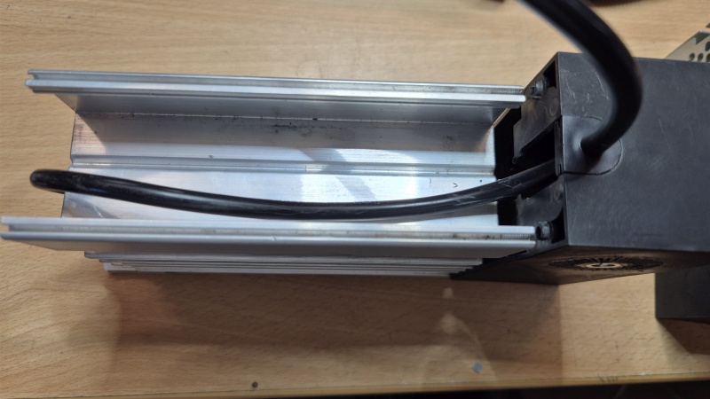Für eine erste Funktionsprobe der Kamera mit dem neuen Netzteil kann man das vorhandene 3adrige Kabel auf der Niedervoltseite des Netzteils bündig abschneiden, abisolieren und mit richtiger Belegung am Meanwell Netzteil anschließen (GND → COM, +5V → V1, +24V → V2). Die Platine dazu wieder fast komplett in den Kühlkörper einschieben und vorsichtig mit einer Spitz- oder Telefonzange das Flachbandkabel des LED-Moduls in den entsprechenden Stecker einschieben.