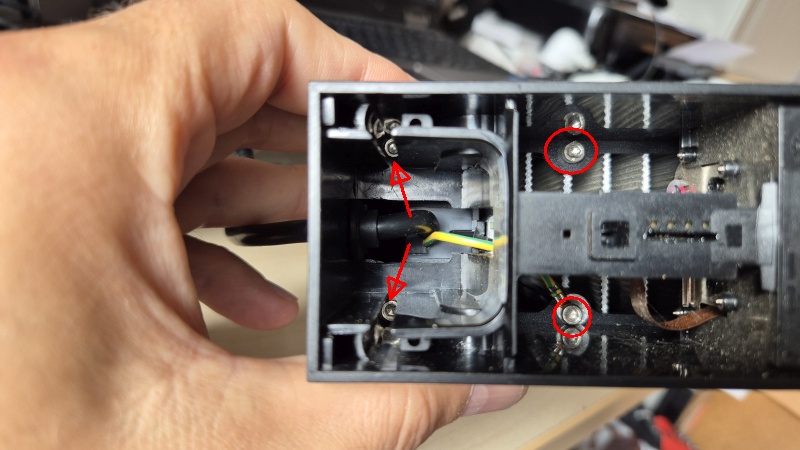 Nun sind alle 6 Schrauben zugänglich und können mit einem 2,5er Inbusschlüssel gelöst werden. Vorsicht beim Entnehmen der Schrauben, entweder mit einer Spitzzange oder mit einem Magneten am Inbusschlüssel.