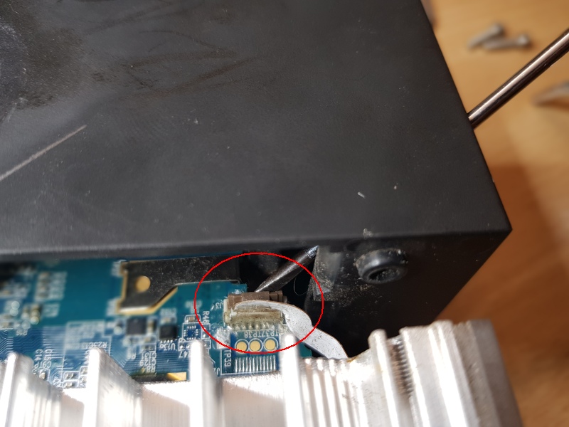 Als nächstes muss das LED-Modul von der Platine getrennt werden. Dazu muss man mit einem feinen Schlitzschraubendreher an der Kameralinse vorbei vorsichtig die Verriegelung des Flachbandkabels hochklappen, anschließend kann mit einer Spitzzange das Flachbandkabel wiederum vorsichtig nach oben aus dem Stecker gezogen werden. Evtl. ist der Stecker mit etwas Heißkleber o.ä. versiegelt, dieser muss vorsichtig entfernt werden.