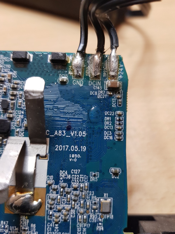Auf der nun freigelegten Platine findet man die drei Anschlüsse GND (Masse), DCIN (+5V) und +24V. Die ganze Platine ist mit einem Schutzlack gegen eindringende Feuchtigkeit geschützt, daher müssen nun vorsichtig die drei Lötpunkte etwas freigekratzt werden, um die Spannungen messen zu können.