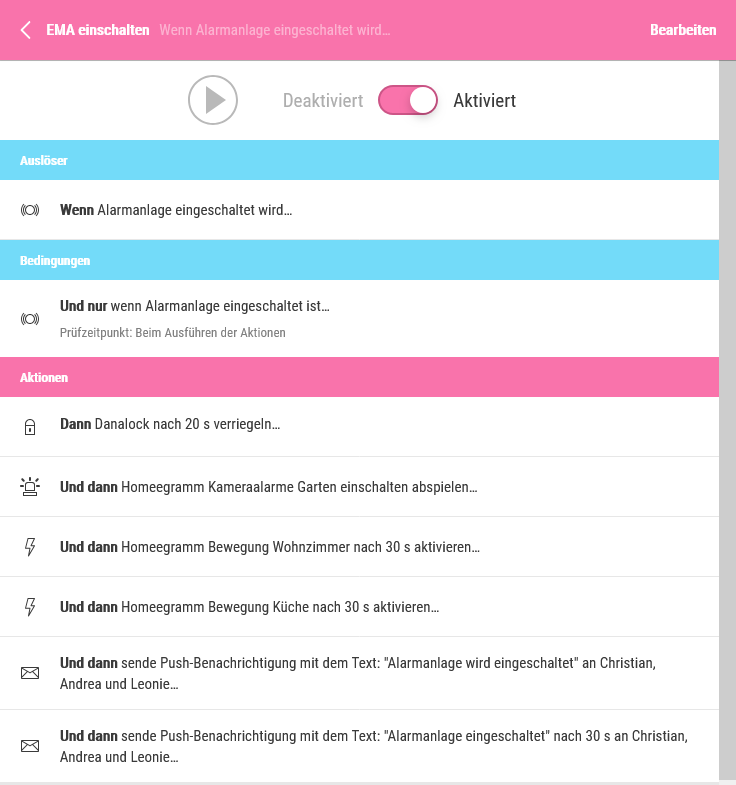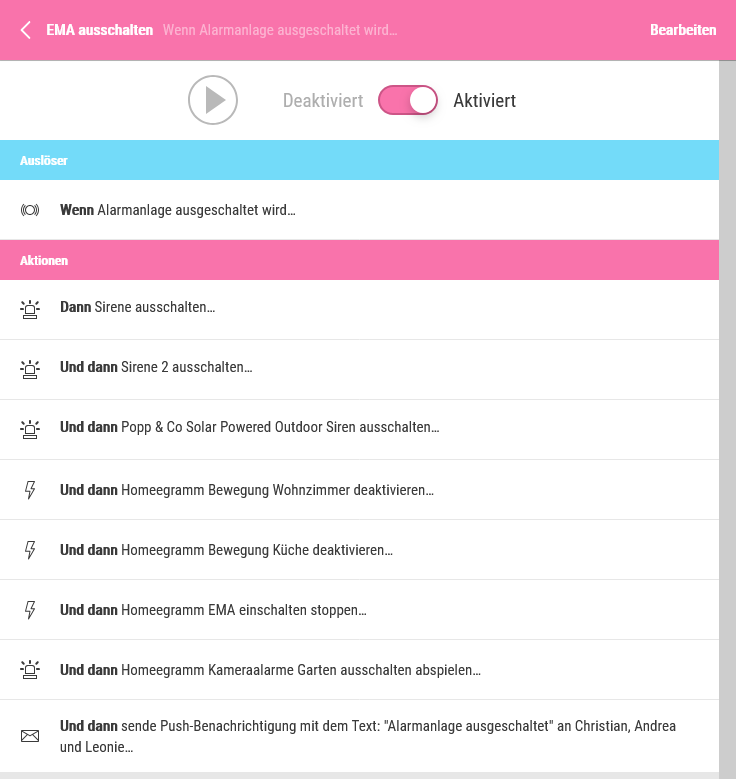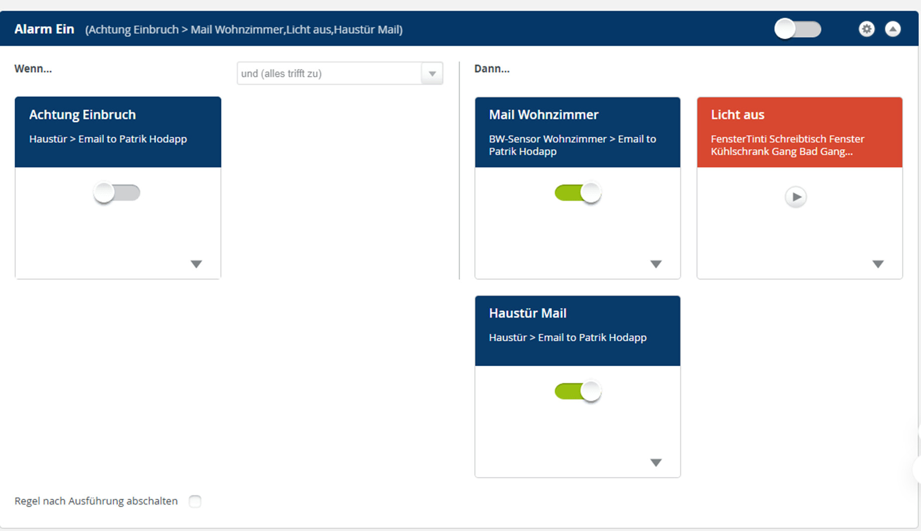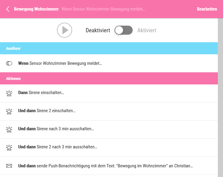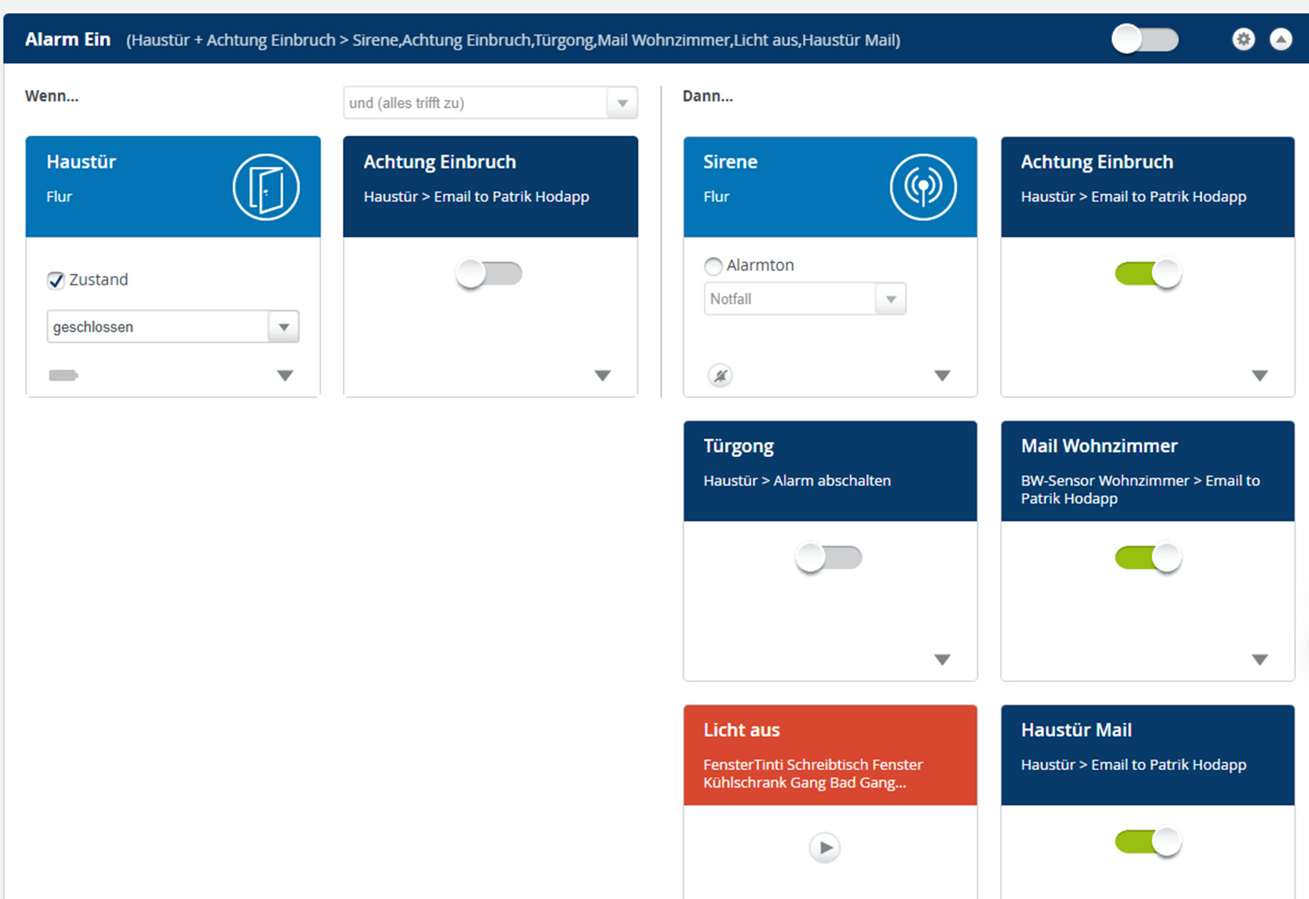 Ich möchte wieder die Alarmanlage in Betrieb nehmen, also quasi etwas in der Richtung von wenn Alarm aktiviert ist und Türsensor offen dann Alarm abspielen. In der alten Devolo Anlage habe ich den Alarm über eine 4 Tasten Fernbedienung scharf gestellt und auch wieder entschärft.