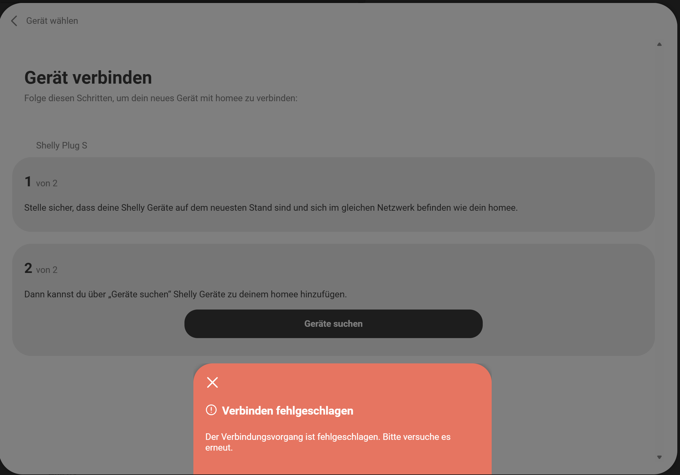 Ich versuche jetzt seit Stunden einen Shelly 1PM Mini Gen3 in meinen homee einzubinden. Habe schon das Forum durchsucht, komme aber nicht weiter. Der Shelly ist in der Shelly App und funktioniert auch. Ebenso kann ich ihn in der FRITZ!box sehen. Also ist er auch im Netzwerk. Wenn ich jetzt im homee unter Gerät hinzufügen den Shelly auswähle und suchen starte kommt eine Meldung Verbindung fehlgeschlagen. Was kann ich noch machen?
