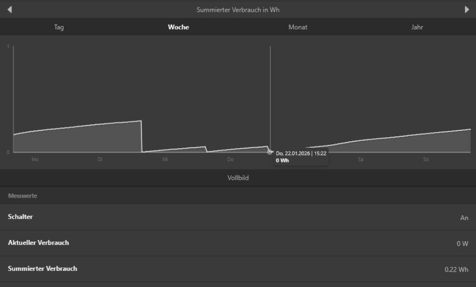 Den Summierten Verbrauch seit Do, 22.01 zeigt homee mit 0,22 Wh an.