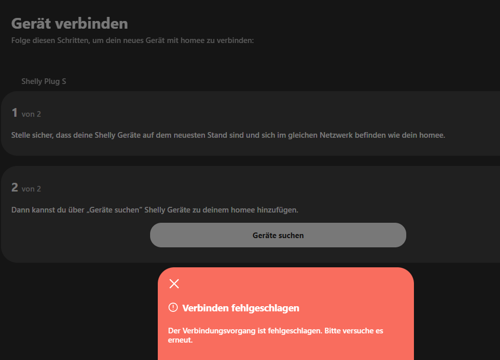 Bei Homee ist mir aufgefallen, dass er anfänglich deutlich länger gesucht hat, bis die Fehlermeldung kam. Einmal hatte er dann auch plötzlich den Shelly 1 mini Gen3 gefunden und ich wollte den gerade anklicken zum einbinden, aber dann kam schon die Fehlermeldung.