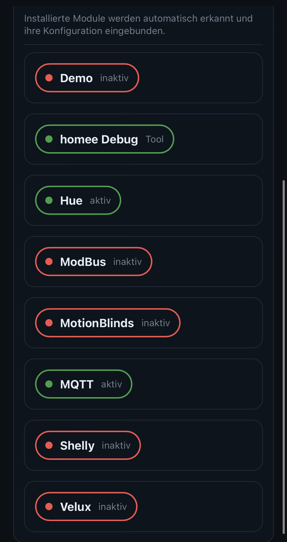 ModBus ist komplett konfigurierbar welches Profil welches Attribut auf welchem Register gehört wird samt Umwandlung je nach Art des Wertes. Dafür gibt es eine webui die das einrichten ermöglicht. Das hih lässt sich auch mit der App direkt anwählen und steuern , Shelly wird automatisch konfiguriert. Hue wird normal über die ip verbunden. Motionblinds wird mit ip und key aus der App konfiguriert. ( bei mir AVOSDIM) Gateway. Velux wird über die cloud eingebunden und Intervallmässig aktualisiert.